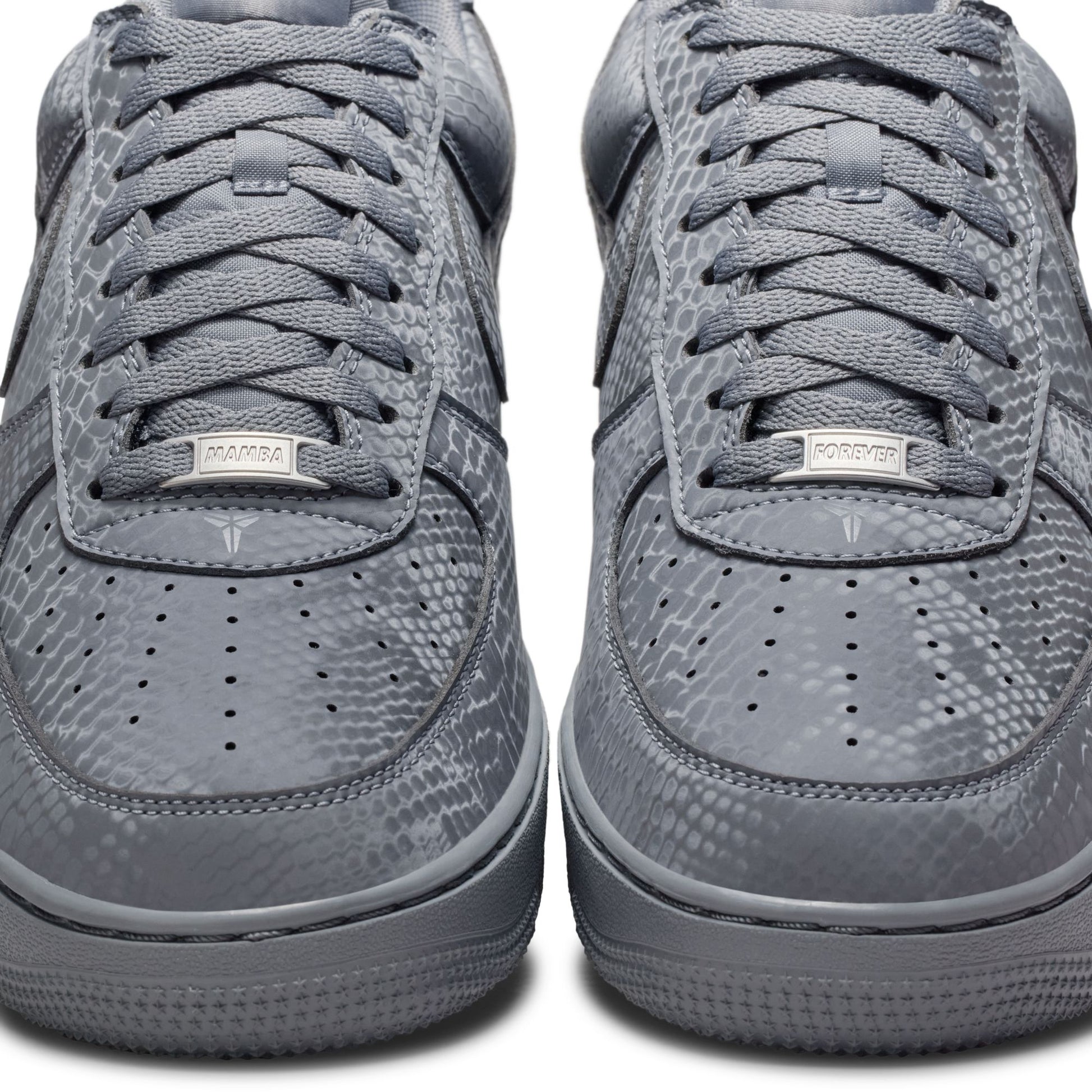 This special-edition AF1 is infused with Mamba DNA, like the allover snakeskin print—putting a distinct spin on an all-time classic. The embroidered "8" and "24" on the heel nod to Kobe's retired jersey numbers, while Sheath logos on the tongue and outer heel add signature branding. Complete with special "Mamba Forever" lace dubraes, this Kobe AF1 continues the legacy.