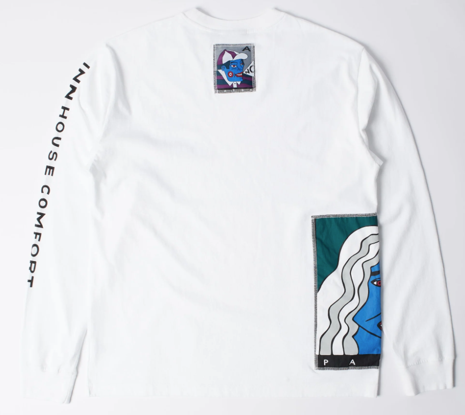 Long sleeve with a big Your face artwork label on the side. Small woven label on the back and water-based screen prints on chest and sleeve. All Parra long sleeves have a boxy custom fit.